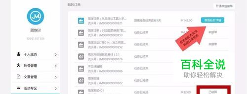 订单任务 订单任务:具体分为“已结算”,“待结算”,"未接单","查看任务详情"四种状态。 点击“查看任务详情”可看到订单的具体内容。 特别说明: 点击任务标题,可查看订单文章原文。 点击“接受任务”,系统自动发布。 要删除订单任务里的某个账号,鼠标停在要发布账号的图标上面,自动出现“—”号,点击即可。