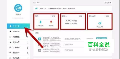 个人主页 进入个人主页可查看您在简媒平台的账号数,影响力和累计收益。 特别说明: 查看:您绑定简媒平台的正常账号数、异常账号数。 影响力:可查看您在简媒平台发文累计阅读量、推荐量 。 累计收益:可查看您在简媒平台接单的累计收益。