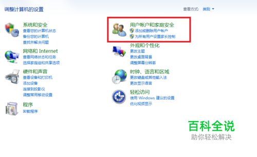 点击开始菜单-控制面板-用户账户和家庭安全,进入目前计算机的用户账户设置界面