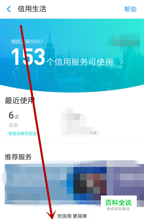 第四步,在打开的【信用出行】界面,点击【综合服务】选项,也可以下拉,找到【综合服务】组