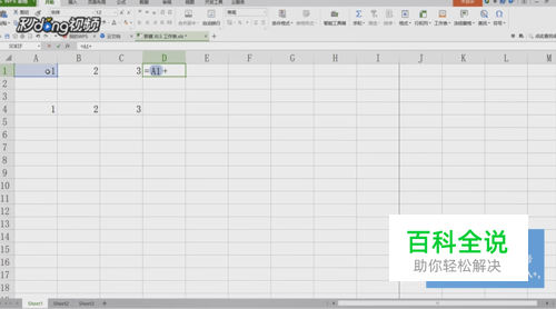 假设我们求和A1到C1,首先在D1内输入个等于号。