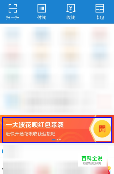 第一步打开手机中的支付宝软件,然后在首页点击如图所示的开通花呗收钱的提示,只要使用支付宝的用户打开软件都会看到这个
