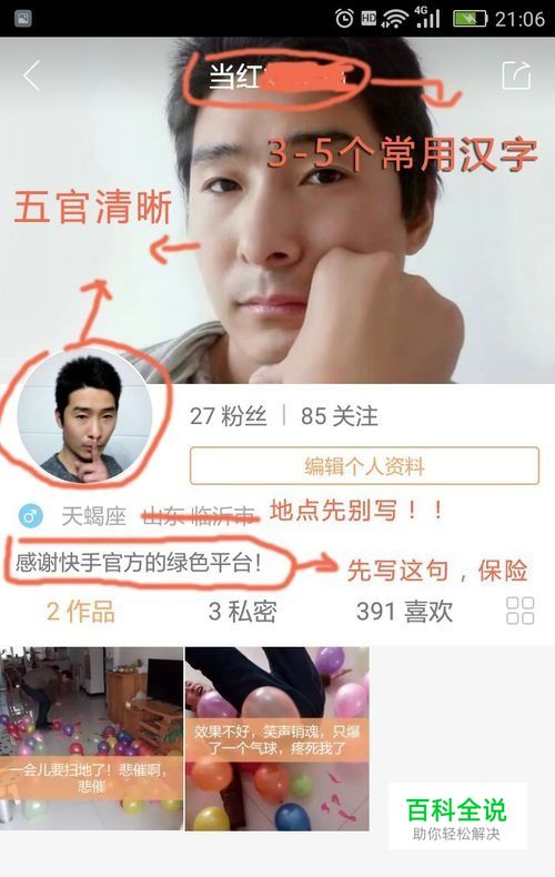 二、主页设置 1. 规范的名字:3-5个常用汉字,作为名称; 2. 绑定手机号; 3. 开通帐号保护; 4. 设置快手号; 5. 填写性别; 6. 生日/星座和所在地,先别填写,等有直播权限再填写。 7. 个人介绍:感谢快手官方的绿色平台! 8. 头像:五官清晰的大头照,有直播权限后,再修改; 9. 背景:最好也先设置为五官清晰的大头照,有直播权限后,再修改。