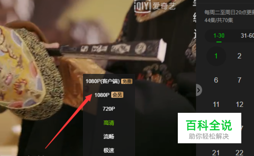 接着点击高清字样,会弹出画质选择小窗口,和手机版不同的是,这里有极速、流畅、高清、720P、1080P(会员),同时提示安装电脑客户端可以免费享受1080P,小编选择1080P。
