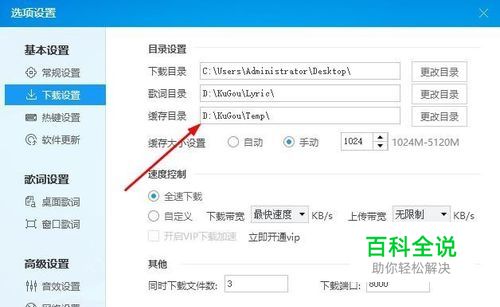 首先,我们打开酷狗音乐设置界面,然后点击下载设置,在这里我们可以看到酷狗试听音乐缓存文件夹