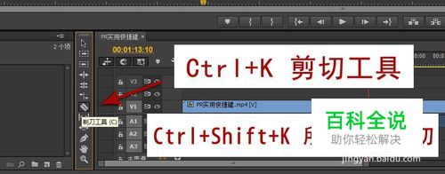Ctrl+K 剪切工具 Ctrl + Shift + K 所有轨道剪切