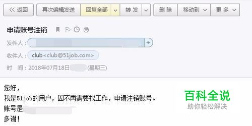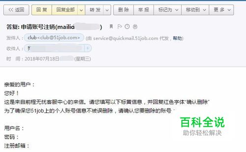 对方发邮件回来,要求回复邮件内容如下。 不过发给小编的邮件里没有标黄也没有红字,但还是能理解的。要写明“ 用户名、密码、注册邮箱”,并加上红色字体“ 确认删除”。(此处如果对发回明文密码有疑虑的可以临时改一个密码,小编我就改成了“51jobadmin”)