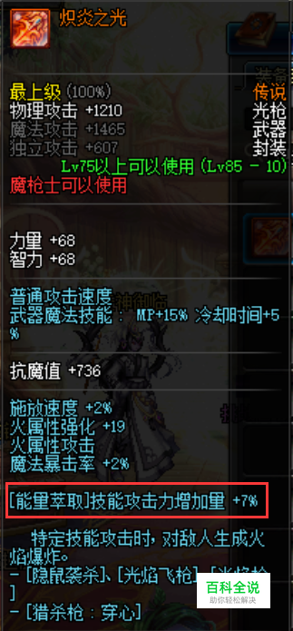武器推荐“炽炎之光”(【能量萃取】技能攻击力增加量+7%),还可以选择以下装备“远洋逐日光枪”(技能Lv+2)、“魔兽杀戮者”(技能Lv+2)。