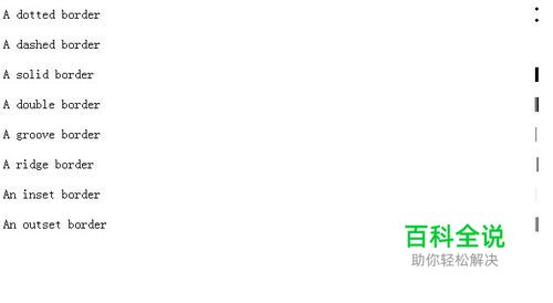 <html> <head> <style type="text/css"> p.dotted {border-right-style: dotted} p.dashed {border-right-style: dashed} p.solid {border-right-style: solid} p.double {border-right-style: double} p.groove {border-right-style: groove} p.ridge {border-right-style: ridge} p.inset {border-right-style: inset} p.outset {border-right-style: outset} </style> </head> <body> <p class="dotted">A dotted border</p> <p class="dashed">A dashed border</p> <p class="solid">A solid border</p> <p class="double">A double border</p> <p class="groove">A groove border</p> <p class="ridge">A ridge border</p> <p class="inset">An inset border</p> <p class="outset">An outset border</p> </body> </html>