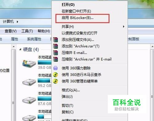 如果U盘也能像手机一样设置密码就好了,就算被人捡到也无法查看里面的内容。这个真的可以有,而且方法很简单,具体步骤如下: 1、将U盘插入电脑,进入【计算机】/【我的电脑】找到你的U盘,然后点击右键 - 点击【启用BitLocker(B)】。