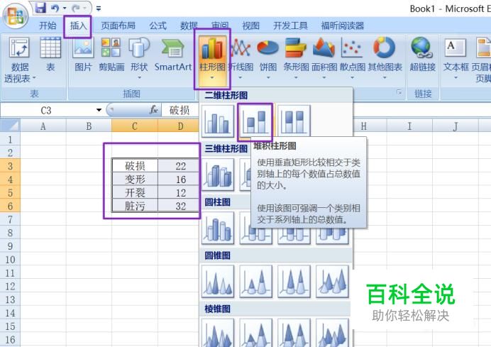 选中该表格,然后点击插入,点击柱形图的下拉箭头,然后选择堆积柱形图;