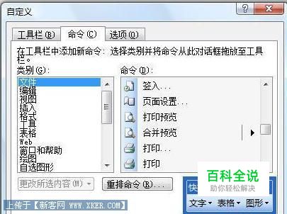 此时,屏幕上便会出现“快捷菜单”工具栏,再单击“命令”选项卡,在“类别”下拉列表框中选择“文件”项,单击“命令”下拉列表框中的“页面设置”后,用鼠标左键将“页面设置”选项拖动至“快捷菜单”工具栏的[文字]按钮上(如图)。