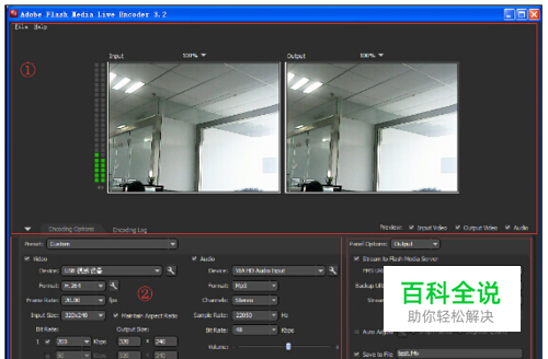 音、视频设置区域: 左边是视频设置区域,右边是音频设置区域,可以根据选择使用音频、视频或者音视频同时开启(通过勾选对应按钮前面的选择框,红框中所示)。设置区域,可以选择音视频的设备、码率、编码方式(注:视频编码要选择h264,否则手机端无法观看)、分辨率、音频采样频率、视频帧率等信息,对照前面的描述调整设置,看看上面的预览区域变化。
