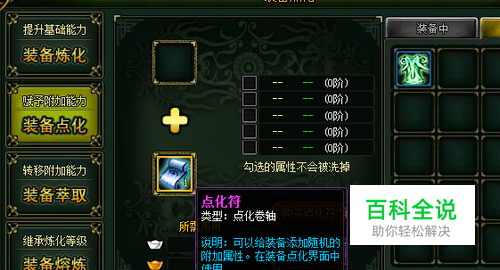 第二:点化装备需在炼化界面进行,点化装备需要消耗一张点化符和几点银子,另外如果需要保留装备上的的有用属性只需要在右边的相应属性位置点上钩,点化之后那些属性就会被保留下来但是相应的也需要一定数量的金子。