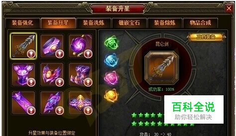 升星系统中,依次开启绿、蓝、紫、橙、皇冠,每种各20级。当某颜色星星升满20级后才能升下一种星星。绿星1-10:无限制 绿星11-20:装备达到40级 蓝星1-10:装备达到50级、绿星达到20星 蓝星11-20:装备达到60级 紫星1-10:装备达到70级、蓝星达到20星 紫星11-20:装备达到80级 橙星1-10:装备达到90级、紫星达到20星 橙星11-20:装备达到100级 皇冠1-10:装备达到110级,橙星达到20星 皇冠11-20:装备达到120级 星石可在boss,项王遗迹副本,国战,赤壁战,商城中获得。 盛世三国2装备系统.jpg 当全套装备都分别达到绿、蓝、紫、橙、皇冠的5星、10星、15星、20星套装时,将激活套装效果。套装效果有额外属性加成,有C界面华丽特效环绕主角。