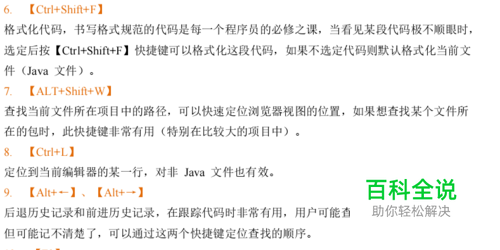 查看和定位快捷键:在程序中,迅速定位代码的位置,快速找到 Bug 的所在,是非常不容易的事,Eclipse 提供了强大的查找功能,可以利用如下的快捷键帮助完成查找定位的工作 【Ctrl+K】、【Ctrl++Shift+K】、【Ctrl+Shift+T】、【Ctrl+Shift+R】、【Ctrl+Shift+G】、【Ctrl+Shift+O】、【Ctrl+Shift+F】、【ALT+Shift+W】、【Ctrl+L】 、【Alt+←】、【Alt+→】、【F3】