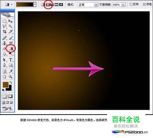 1、新建一个800 * 600像素文件,前景色设置为:#784a00,背景色设置为黑色,选择渐变工具拉出下图所示的径向渐变。