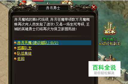 《烈火战神》赤月天魔副本要求:玩家等级大于等于40级,每天进入副本次数为2次,副本奖励大量经验,副本通过时间为30分钟(时间段内不能通过将会自动传送出副本外),建议玩家组队。