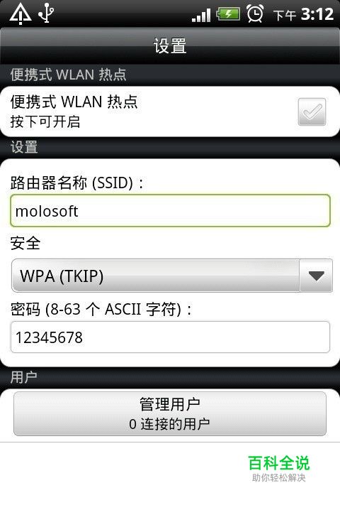 设置好路由器名称(必须是英文)和密码之后就可以打开WLAN热点了。出现下图说明手机便携式WLAN热点设置成功。