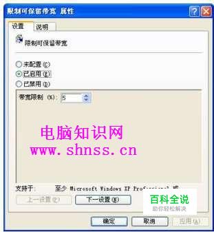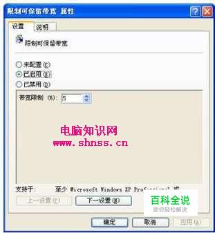 3.在“设置”选项卡中我们可以看到:WindowsXP系统默认的“带宽限制”的值是20%。将其改为0或者是5%等较小的数字,点选“已启用”单选钮;然后再点击【确定】按钮即可将新的设置存入计算机中。
