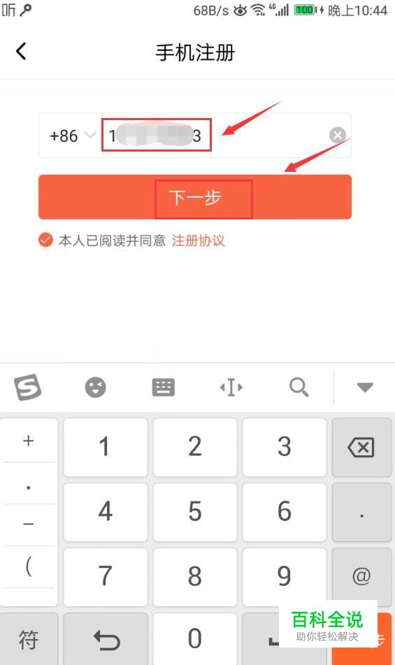 来到了注册界面,我们输入手机号,点击“下一步”,如图所示。