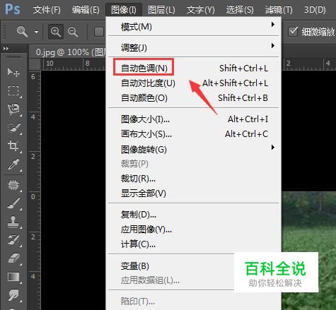 打开Photoshop之后我们按下Ctrl+O键在弹出的对话框内选择需要修改的图片,然后在图形里找到自动色调选项,如图所示: