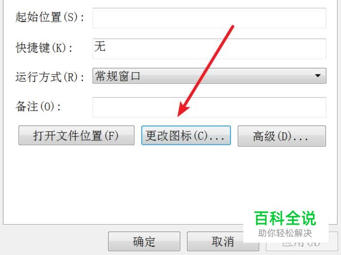 打开属性窗口后,在‘快捷方式’栏,点击‘更改图标’