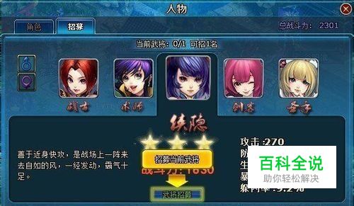 武将招募 当玩家等级到达30级时,便可以进入人物界面中的武将招募界面招募武将。之后,随着玩家等级的提高,可招募的武将的数量将增多。玩家最多可以携带8名武将,但是每次只能选择4名武将跟随玩家参加战斗。