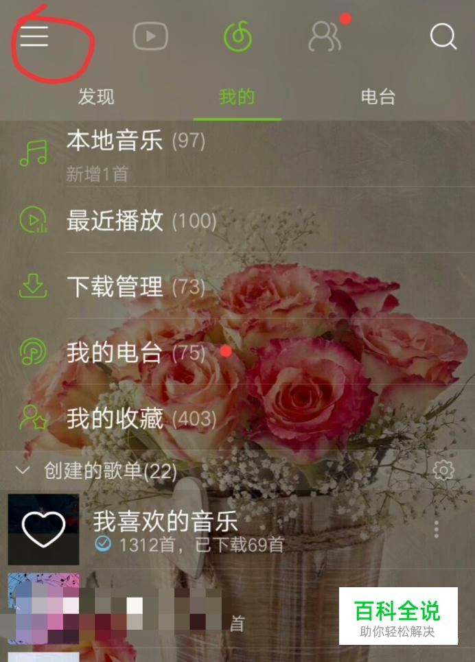 在网易云音乐界面点击左上角三条直线的图标,如下图所示。