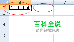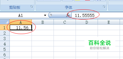 假设我们在A1单元格中的数值是11.55555,我们想在B1单元格中显示A1四舍五入后小数点后两位的结果,如图所示。