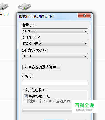 弹出格式磁盘界面,选择快速格式化,点击开始。