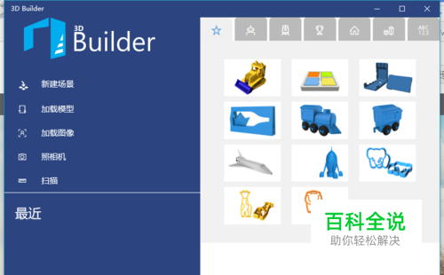 首先我们点击开始菜单,然后在#分类中找到“3D Builder”,点击打开后便来到了软件主界面,左侧的工具栏里可以新建模型或者从原有的图片转换过来,右侧视图内则为微软提供的一系列示例,我们点击左侧的“新建模型”