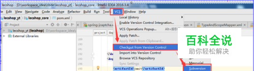 Idea使用svn更新项目至本地,先找到VCS菜单。找到subversion选项。