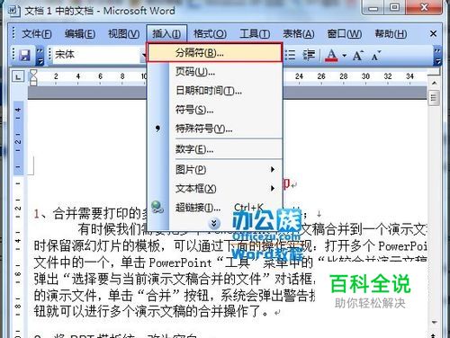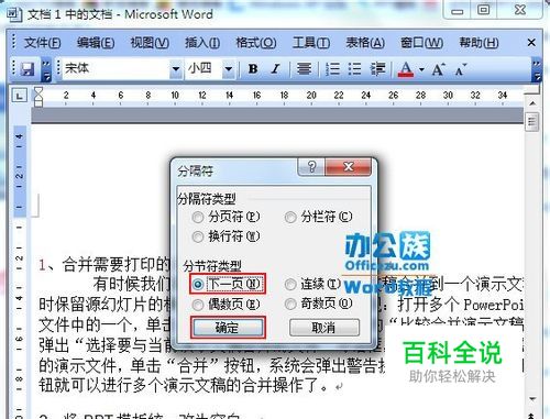 在“分隔符”中选择“分节符类型”的“下一页”并按“确定”。