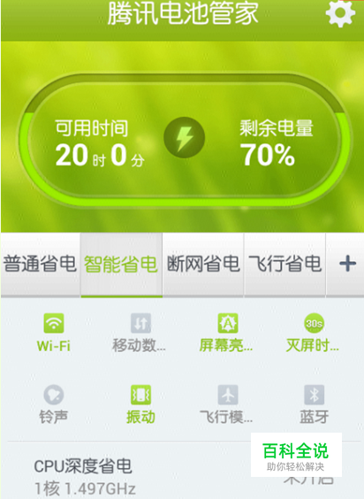 腾讯推出的手机管家中,电池管家省电功能较为齐全,安装腾讯手机管家后进入主界面,即可在健康优化一栏中找到电池健康功能。电池管家主要提供三种服务,分别为省电管理耗电排行及充电维护。省电管理功能中管家主要提供4种省电模式、及一种自定义省电模式。