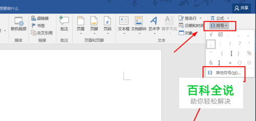 切换到【插入】选项卡,点击符号组的【符号】的下拉箭头,选择【其他符号】