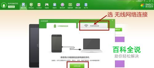 选择 无线网络连接,并按图示步骤操作,完成手机上的软件对电脑上无线连接二维码的扫描连接工作。