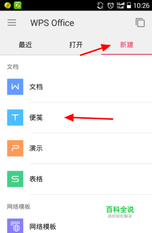 打开手机上的wps,切换到新建选项卡,选择“便签”