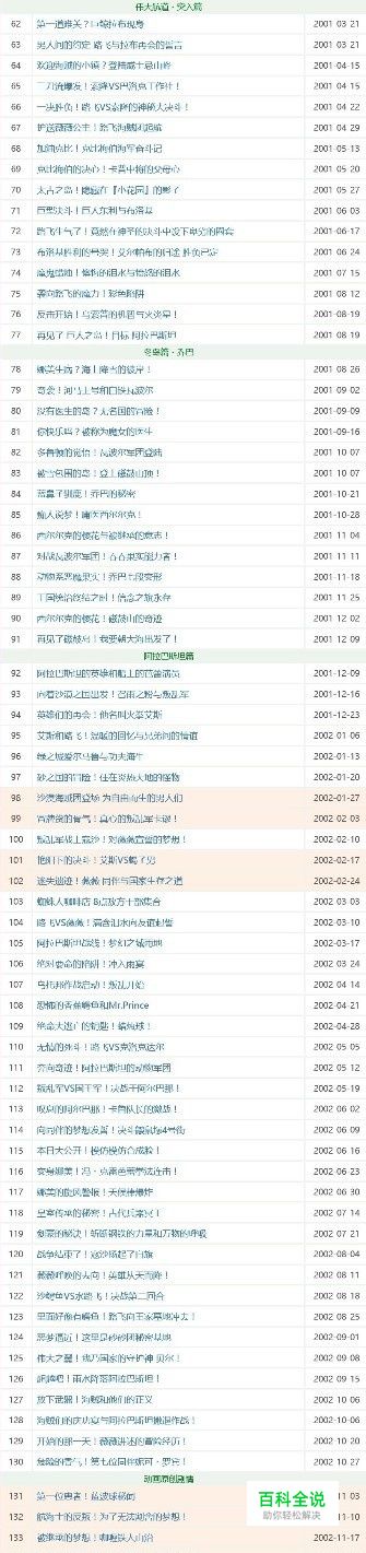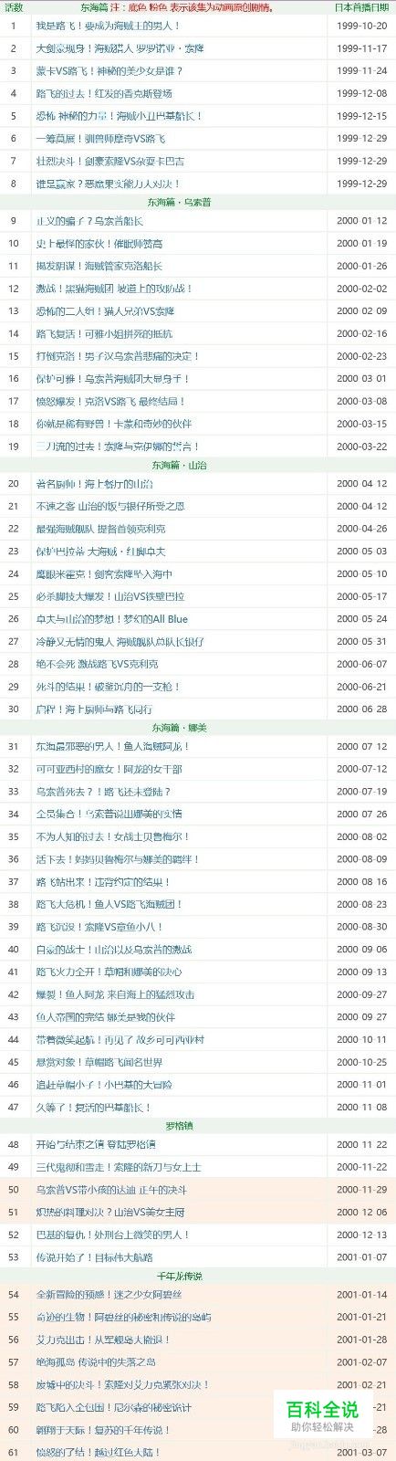 东海篇 ●伙伴篇(1~8) ●乌索普篇(9~19) ●山治篇(20~30) ●娜美篇(31~47) ●罗格镇篇(48~53) ●千年龙传说篇(动画原创,54~61)