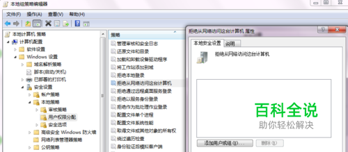 计算机配置->windows设置-安全设置->本地策略->用户权限分配->拒绝从网络访问这台计算机,如下图所示,打开“拒绝从网络访问这台计算机”,删除“Guest”账号,并点击下面的应用按钮。 我这里是已经删除后的。现在是空白的。