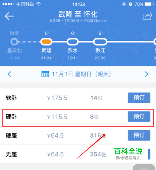 在这里我们就可以看到座位类别、价格和剩余张数,假设我们要购买下铺,那么我们在硬卧那一栏点击【预定】
