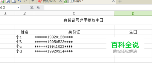 将身份证上的生日进行提取出来,是excel提取数字中较为常用的一种。如下图数据的填充,分为姓名+身份证号码,