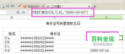 对数据进行提取之前需要考虑数据的特征,如身份证号码的长度和属性,可以知道生日是从第7位数字开始的8个数,如下图“=TEXT(MID(C5,7,8),"0000-00-00")”提取生日