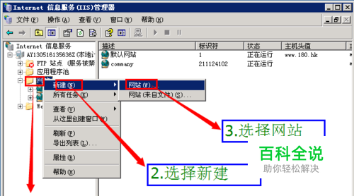 IIS打开后,选中 网站,然后右键,在弹出的菜单中,选择 新建,然后选择 网站;如下图所hi: