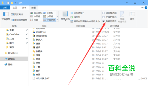 到了这一步我们需要设置查看隐藏文件夹,win10系统是点击查看,勾选 隐藏的项目。 win7系统的是在窗口顶部靠左位置的“组织”菜单,选择其中的“文件夹和搜索选项”。里面有个查看。显示隐藏的文件、文件夹或驱动器 或者在工具里面的文件夹选项 到了这里可以查看隐藏文件了,知道目录是什么意思的人,我直接把应该删除的目录给你,自己去找下C:\用户\[用户名]\AppData\Local\Adobe\OOBE文件夹 然后直接来到15步