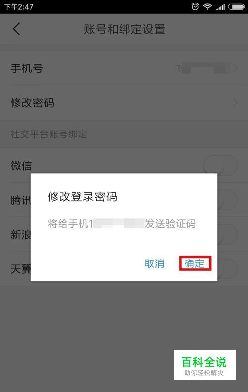 点击“修改密码”,此时会弹出一个向手机发送验证码的请求,点击确定,发送验证码。