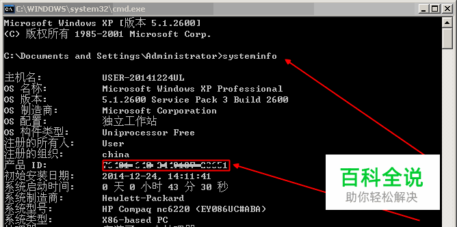 第三种:进入电脑的“CMD命令”界面,输入“systeminfo”后回车,在现实的信息中就有产品ID的信息。这种方法不受系统的限制,方便快捷!