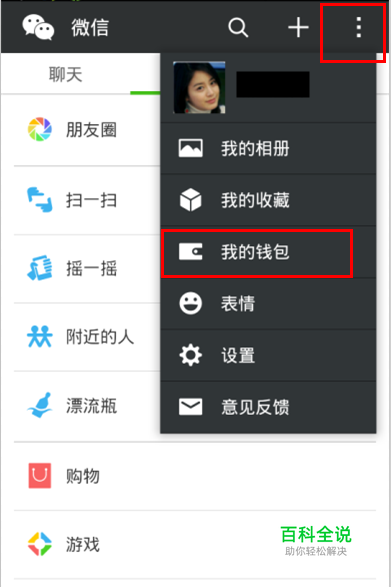 打开微信首页,点击右上角的菜单按钮,选择我的钱包