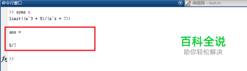 第一步我们使用MATLAB计算极限的limit函数,去计算函数f(x)=(x^3 + 5)/(x^4 + 7)极限,其中x是接近于0,代码如下图所示: