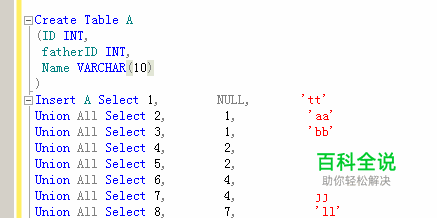 先建立需要测试的表格,及插入测试数据Create Table A(IDInt, fatherIDInt, NameVarchar(10))Insert A Select 1, NULL, 'tt'Union All Select 2, 1, 'aa'Union All Select 3, 1, 'bb'Union All Select 4, 2, 'cc'Union All Select 5, 2, 'gg'Union All Select 6, 4, 'yy'Union All Select 7, 4, 'jj'Union All Select 8, 7, 'll'Union All Select 9, NULL, 'uu'Union All Select 10, 9, 'oo'GO
